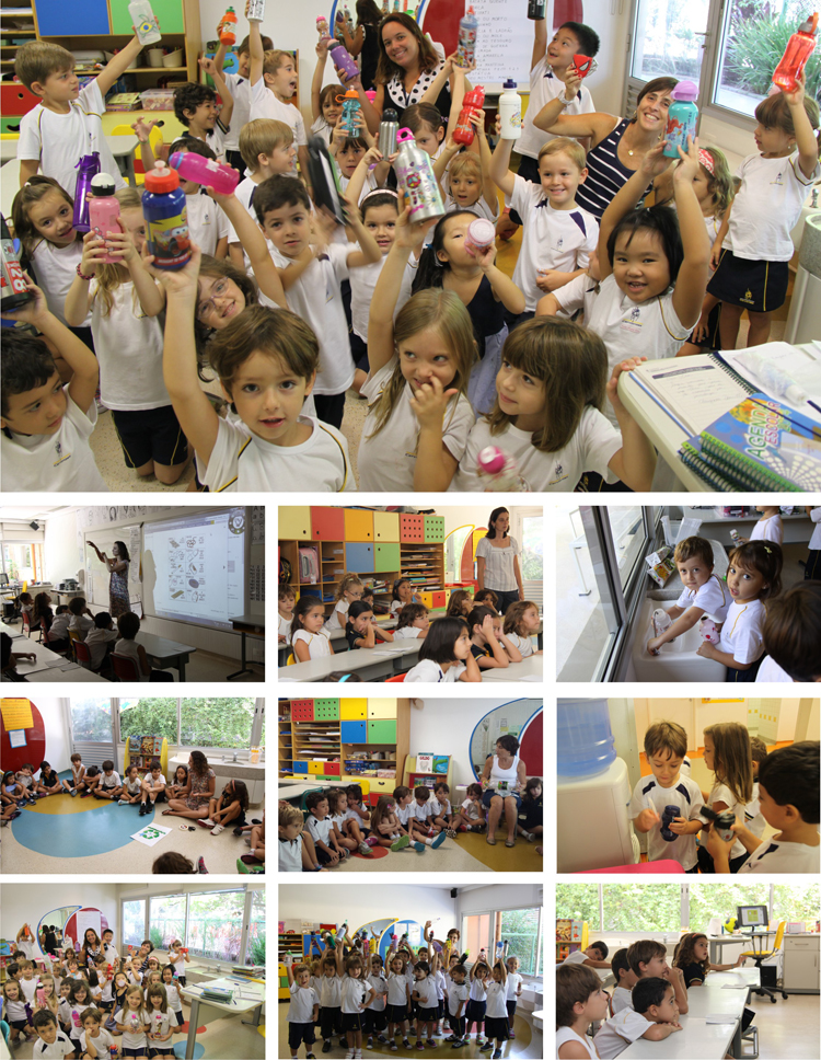 Para los niños de Infantil I, que tienen entre 3 y 4 años, guardar el botellín es tarea estimulante: “Además de la toma de conciencia de la necesidad de ahorrar agua y escatimar vasos, cada vez que llena el botellín, el niño trabaja la cognición al manosearlo, dosificar la cantidad de agua, saber dónde lo deja y certificarse de sus condiciones de higiene. Esta práctica aunque supervisada por las profesoras, impulsa su autonomía y responsabilidad”, explica la profesora Clei Gil Muner de Infantil IB.