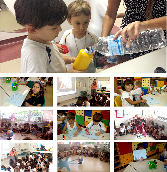 En todas las clases de Educación Infantil y 1º, los alumnos reflexionaron sobre los hábitos cotidianos y sus consecuencias a partir de la presentación del libro O Camelo, o Burro e a Água. Los alumnos de 1ºC compararon sus actitudes con las de los personajes y hablaron sobre la reutilización del agua no apta para el consumo humano pero sí para la limpieza. Tras una estimulante conversación sobre los beneficios del agua y su importancia, los alumnos de Infantil A escucharon atentamente la historia y luego la narraron con dibujos.