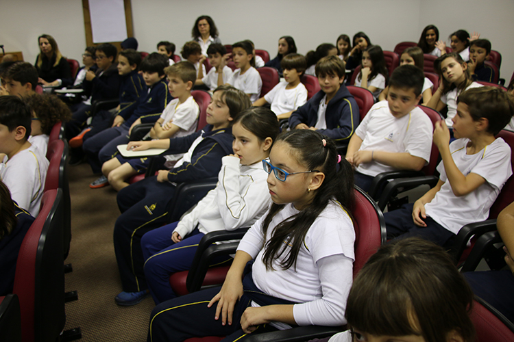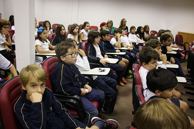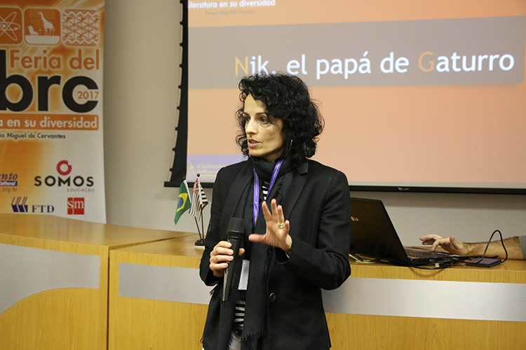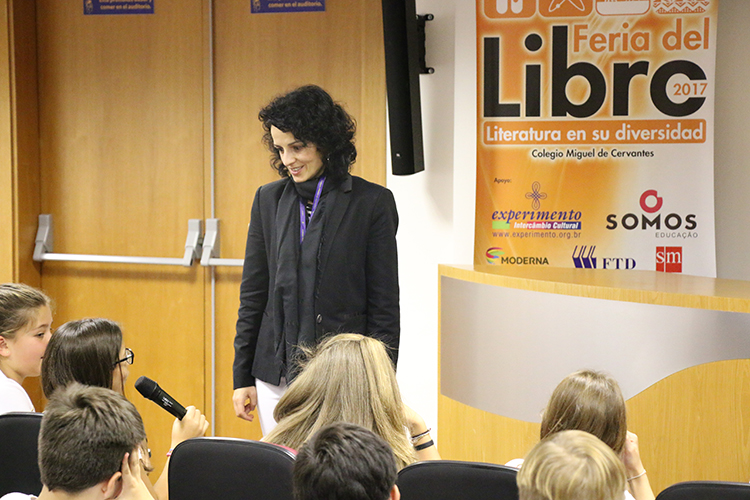 Momentos antes de apresentar o vídeo do autor aos alunos a diretora gerente, Lourdes Ballesteros, e o chefe de estudos, César Bardilho, conversaram com os alunos sobre as características do livro “Gaturro y el secreto de los inmortales“, leitura trabalhada nas aulas de espanhol durante o 1º trimestre.