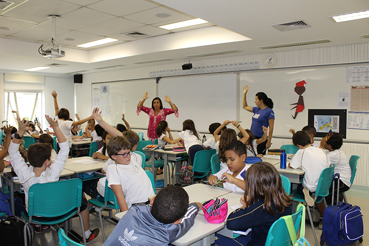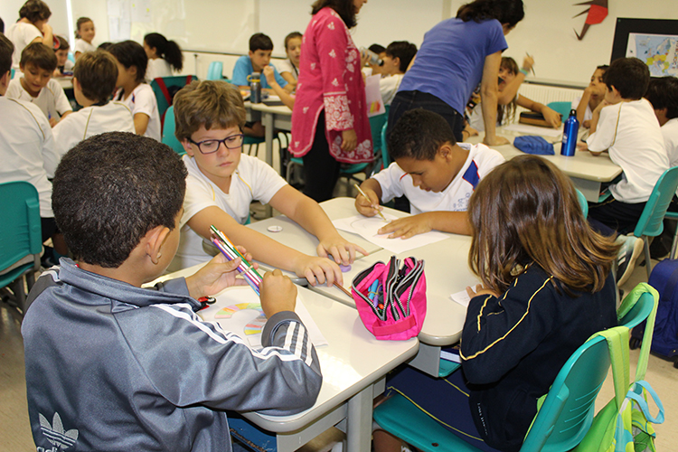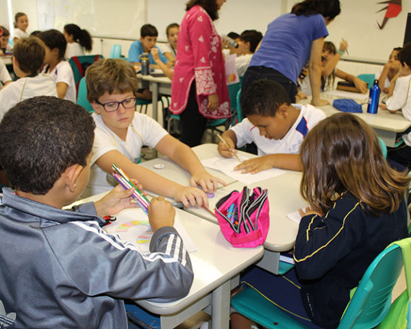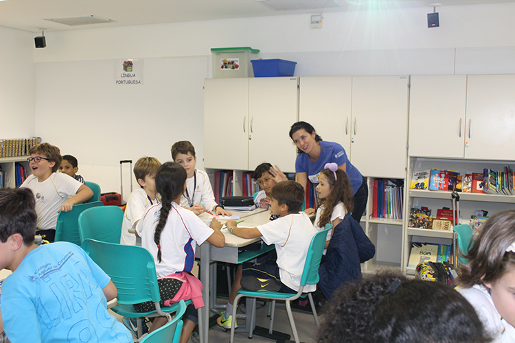 No dia 17 de maio, os alunos do 4º ano B receberam a visita dos alunos do Cervantes Solidário para as atividades de confecção e montagem do estande da Feira do Livro.