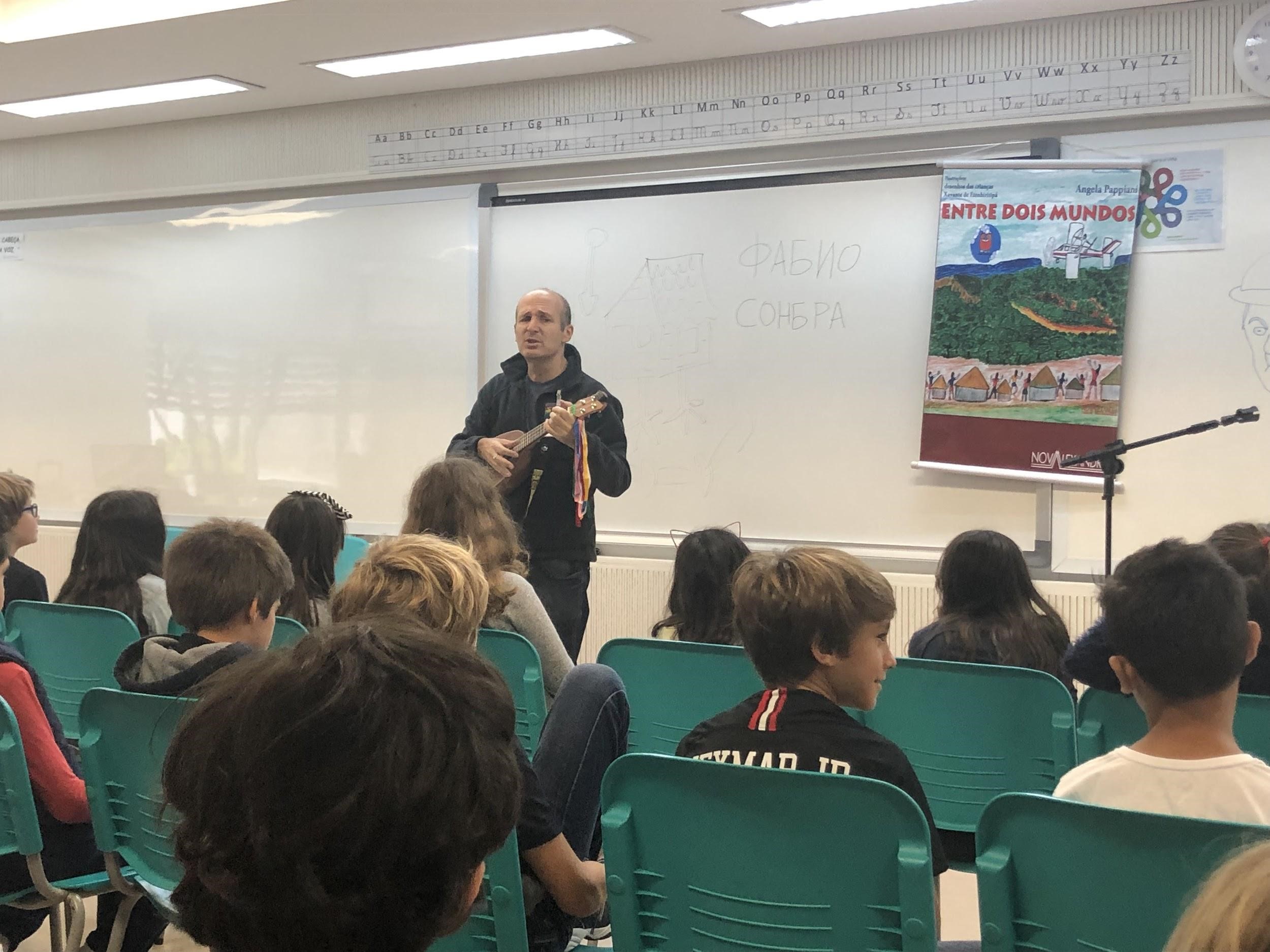Durante a palestra, Fábio apresentou muitas informações sobre seu livro, Taya e o espelho da Baba Yaga, cuja personagem principal, chamada Baba Yaga, é uma bruxa que mora em uma floresta com seu ajudante, um corvo. O livro será lido pelas crianças do 5º ano no segundo semestre. Fábio chegou a interpretar um dos personagens de uma de suas histórias, que envolve um homem e uma onça que quer vingança por suas ações. O autor ensinou às crianças algumas letras e como escrever seu nome em russo, e a reação delas foi inigualável. Elas nunca tinham visto algo parecido e nunca pensaram que aqueles caracteres fossem letras em outras línguas.