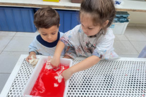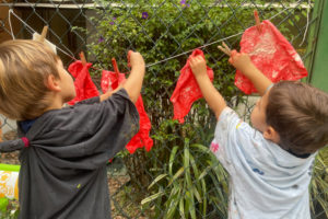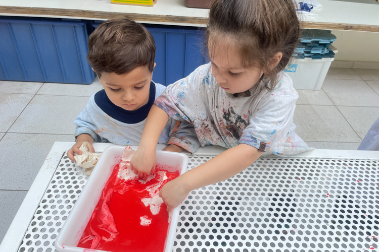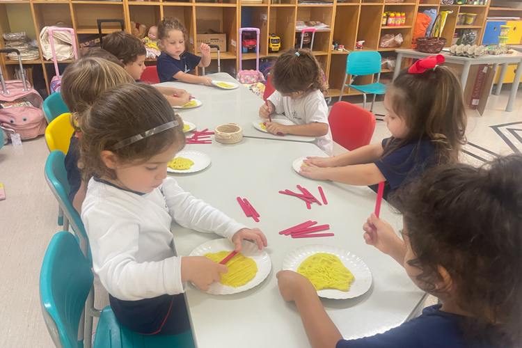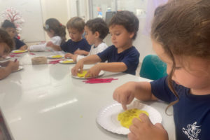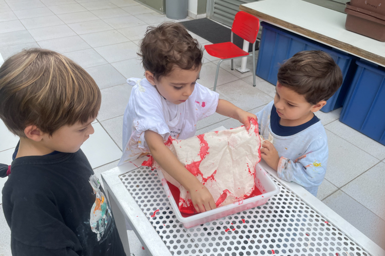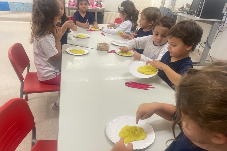 A exposição do Infantil 3 convida você a percorrer esse caminho: um cenário encantador com mesa posta, cadeiras ocupadas por animais cuidadosamente representados, aromas que flutuam no ar em pequenos saquinhos e um grande caldeirão cheio de ingredientes in natura. Tudo isso acompanhado do livro construído pelas crianças, que documenta as etapas de um projeto coletivo cheio de afeto, criatividade e aprendizado.