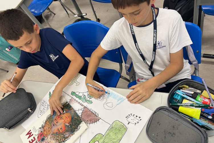 Para registrar todo esse aprendizado, criaram scrapbooks onde reuniram memórias do projeto. Ilustrações feitas por meio de colagem, desenho e costura também foram desenvolvidas, servindo como inspiração para a produção de textos. O processo de transformar imagens em palavras permitiu que os alunos expressassem suas próprias interpretações e sentimentos.