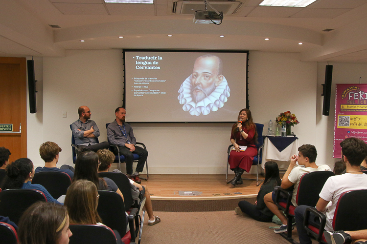 No dia 15 de maio, como parte da programação da Feira do Livro 2025, os alunos do 2.º ano do Programa do Diploma e das turmas A, B e C do 3.º ano do Ensino Médio participaram da mesa-redonda “Traduttore, traditore: labirintos da tradução”, no auditório do Colégio Miguel de Cervantes.