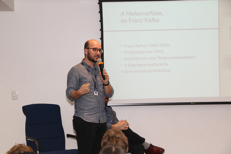 El profesor Giovane Rodrigues Silva, con formación en filosofía y experiencia en la traducción de obras del alemán, habló sobre La Metamorfosis, de Franz Kafka. Destacó la importancia de conservar aspectos sutiles de la escritura kafkiana —como el humor, el ritmo e incluso la puntuación— en la versión en portugués, para preservar la intención original del autor.