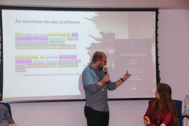 O professor Giovane Rodrigues Silva, com formação em filosofia e experiência na tradução de obras do alemão, falou sobre A Metamorfose, de Franz Kafka. Ele destacou a importância de manter aspectos sutis da escrita kafkiana — como o humor, o ritmo e até a pontuação — na versão em português, preservando a intenção original do autor.