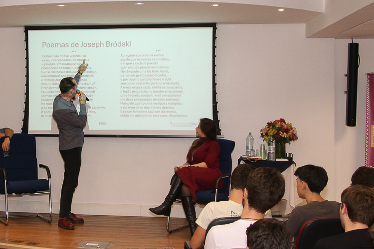 Já o professor Fábio Brazolin Abdulmassih, tradutor do livro Russo Essencial e de poemas de Joseph Brodsky, abordou os desafios específicos da tradução poética do russo, ressaltando como elementos como sonoridade, repetição e intenção muitas vezes se perdem ou precisam ser recriados em outra língua.