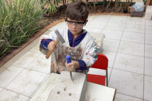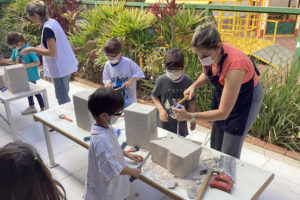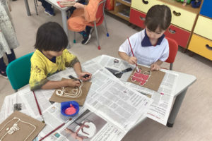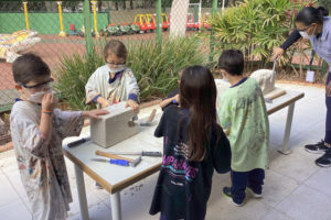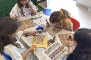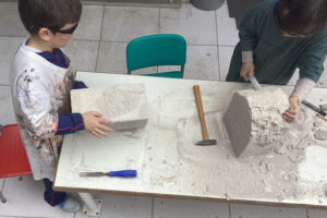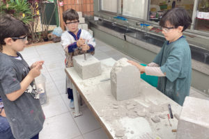 La tercera parte del taller ha estado dedicada a la arquitectura y escultura, donde los alumnos construyeron una pirámide escalonada utilizando cajas recicladas, inspirándose en las monumentales construcciones de ciudades como Tikal y Chichén Itzá. También han creado esculturas decorativas representando deidades, animales sagrados y elementos de la vida cotidiana maya. Cada alumno recibió una piedra porosa sobre la que trabajó de forma individual, utilizando herramientas como grifos, martillos, limas y estacas para esculpir sus propias creaciones. Esta actividad manual les permitió experimentar de forma directa la técnica del tallado en piedra, muy utilizada por los mayas en sus esculturas y monumentos. A través de este proceso, los estudiantes no solo desarrollaron habilidades motrices y creativas, sino que también establecieron una conexión más profunda con la cultura estudiada, comprendiendo el esfuerzo, la precisión y el simbolismo detrás de cada obra artística de esta antigua civilización.