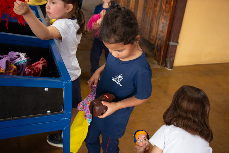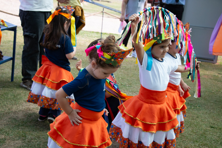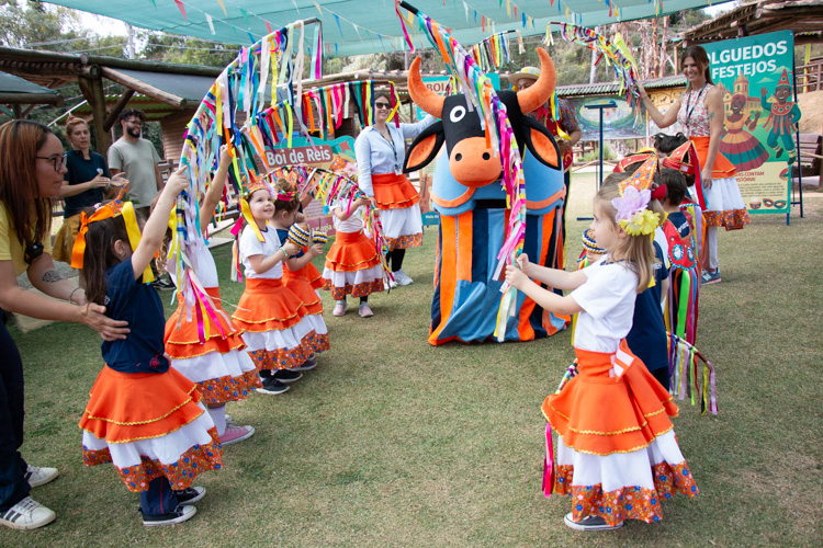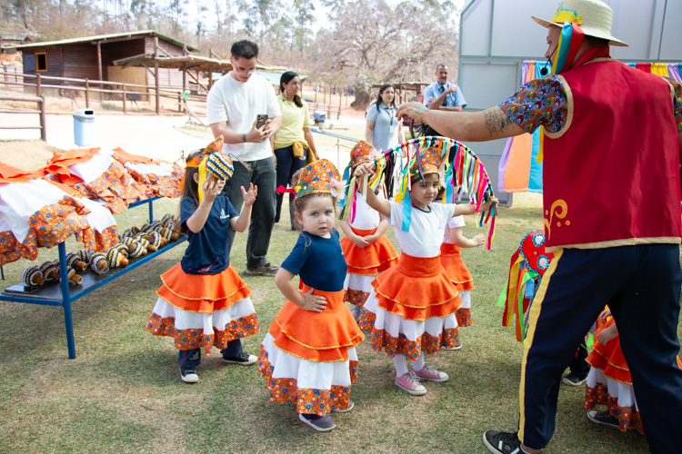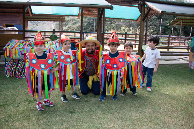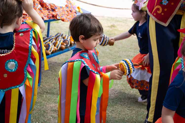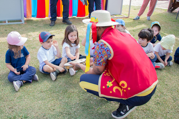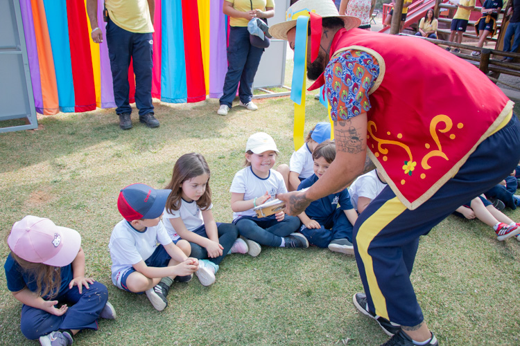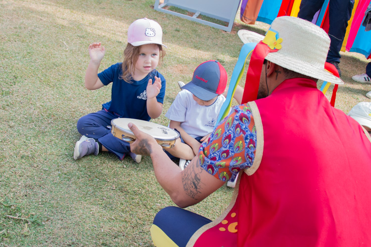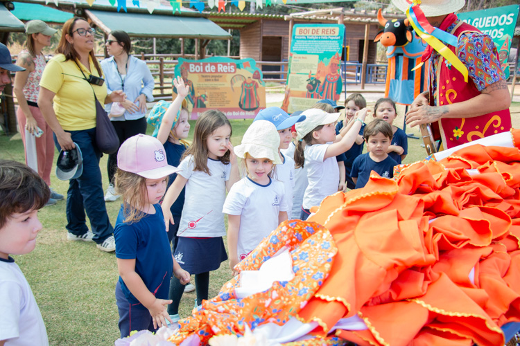 Na estação Folguedos e Festejos, os pequenos tiveram contato com a riqueza das festas brasileiras e participaram de uma vivência do ritmo maracatu, com direito a figurino, instrumentos, coreografia e muita alegria.