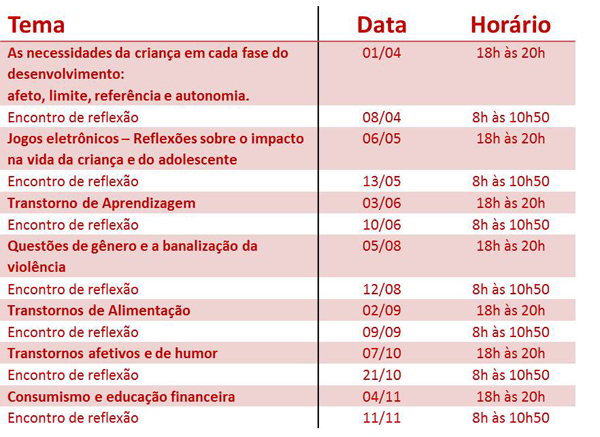 A palestra marcou o início das atividades do Espaço, que, em 2014, apresentará uma nova configuração de encontros. Na sequência, dia 8 de abril, às 8h, a equipe de apoio psicopedagógico do Colégio convida a todos os pais para uma reflexão sobre o tema da palestra no auditório do Colégio.