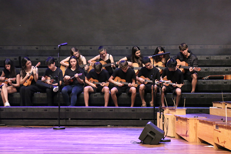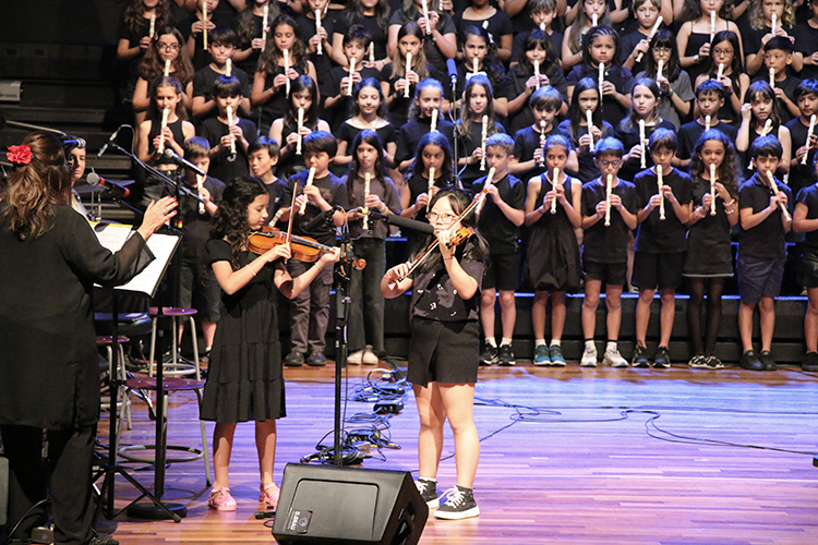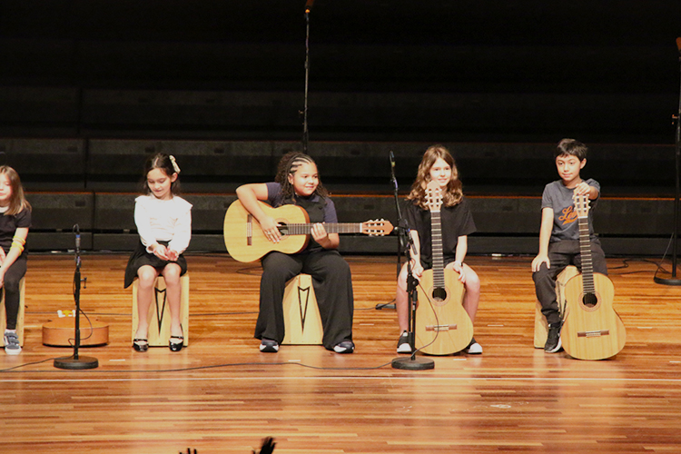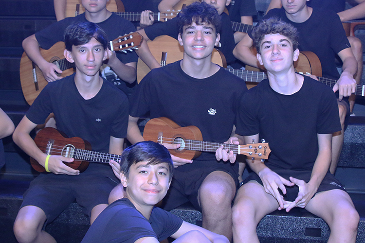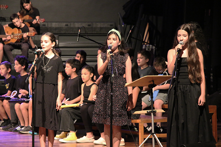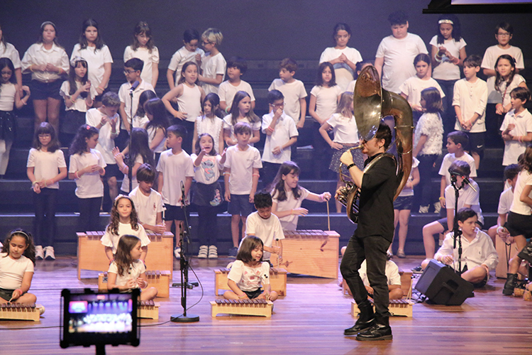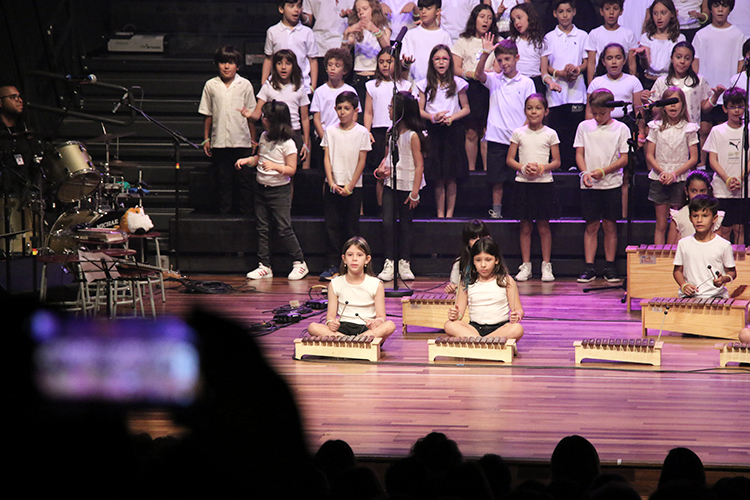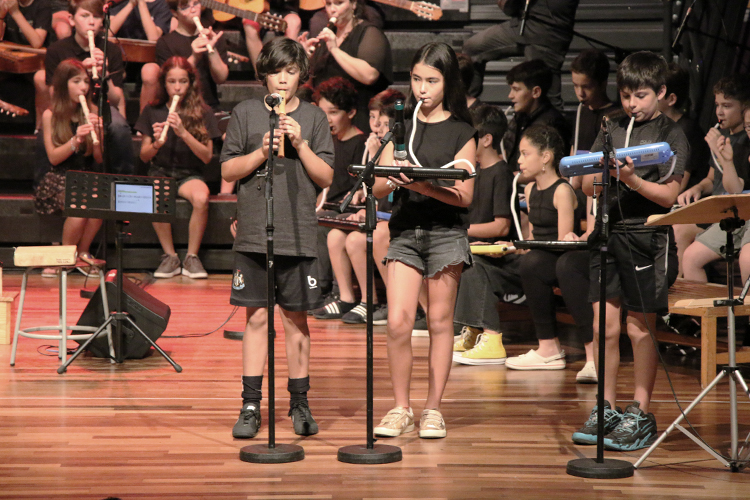 Os alunos dos 3º e 4º anos dos cursos extras de percussão e violão brilharam no palco, acompanhados pelos seus professores, Ricardinho Paraíso e Gabriel Bortolatto, que estiveram ao lado deles, guiando e apoiando em cada nota. A apresentação foi um verdadeiro momento de protagonismo para os alunos, que demonstraram talento e dedicação com a orientação e expertise de seus mestres.