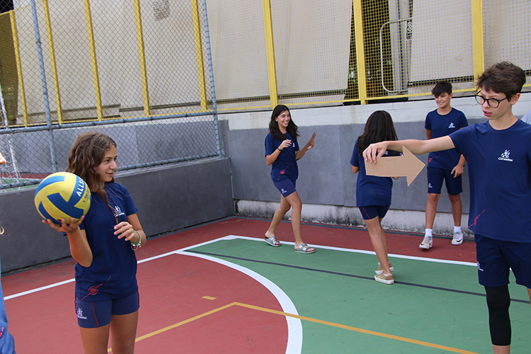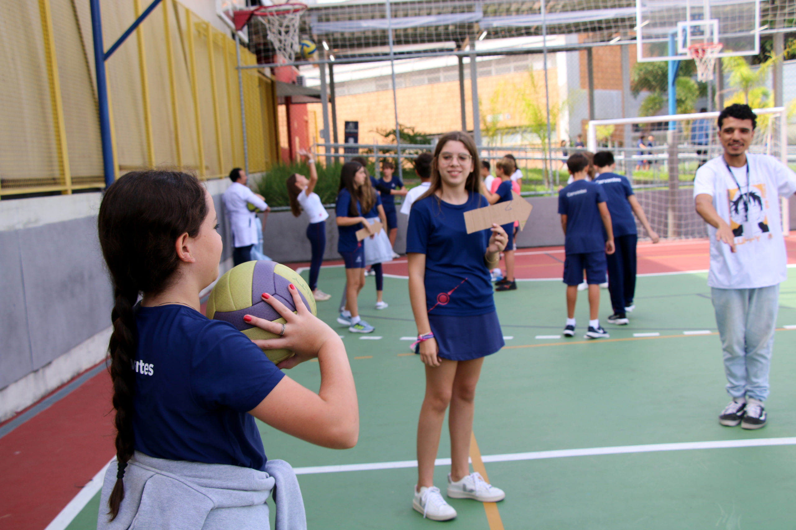 Para a realização do experimento, os estudantes se separaram em grupos. Fazendo uso de uma bola de vôlei e de um vetor representado por uma seta, eles dimensionaram a direção, sentido e intensidade com que a esfera deveria ser arremessada por seus colegas. Recorrendo ao que foi constatado, os alunos fizeram a observação da trajetória do objeto sob ação dessa grandeza.