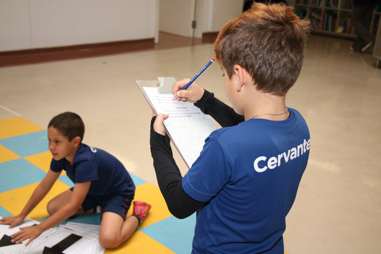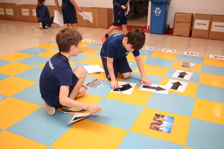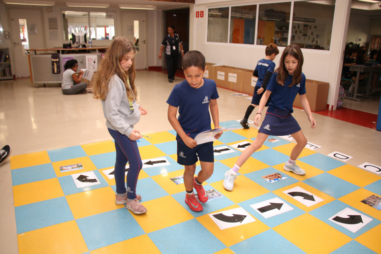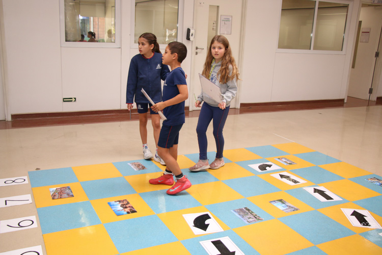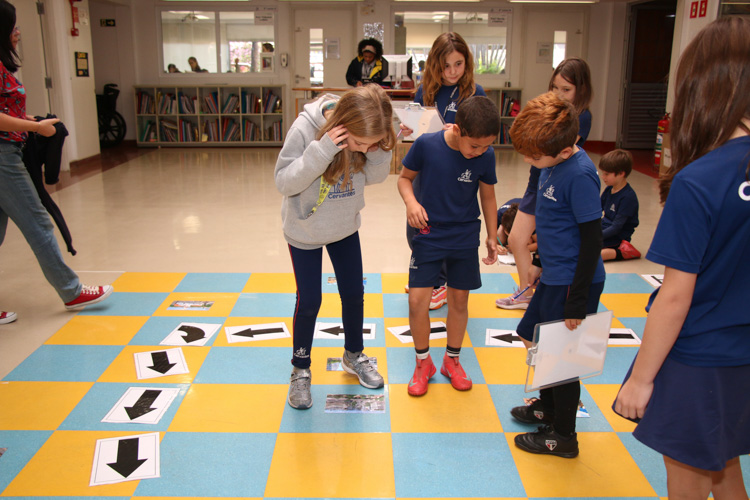A atividade foi realizada em duplas, em um tabuleiro de xadrez gigante montado no chão, representando o centro da cidade de São Paulo. Nele foram posicionadas imagens de locais históricos já estudados em sala de aula e contemplados no livro. Cada dupla recebeu um desafio específico: sair de um ponto inicial e, seguindo pistas e coordenadas identificadas por letras e números em colunas e fileiras, encontrar o destino final.