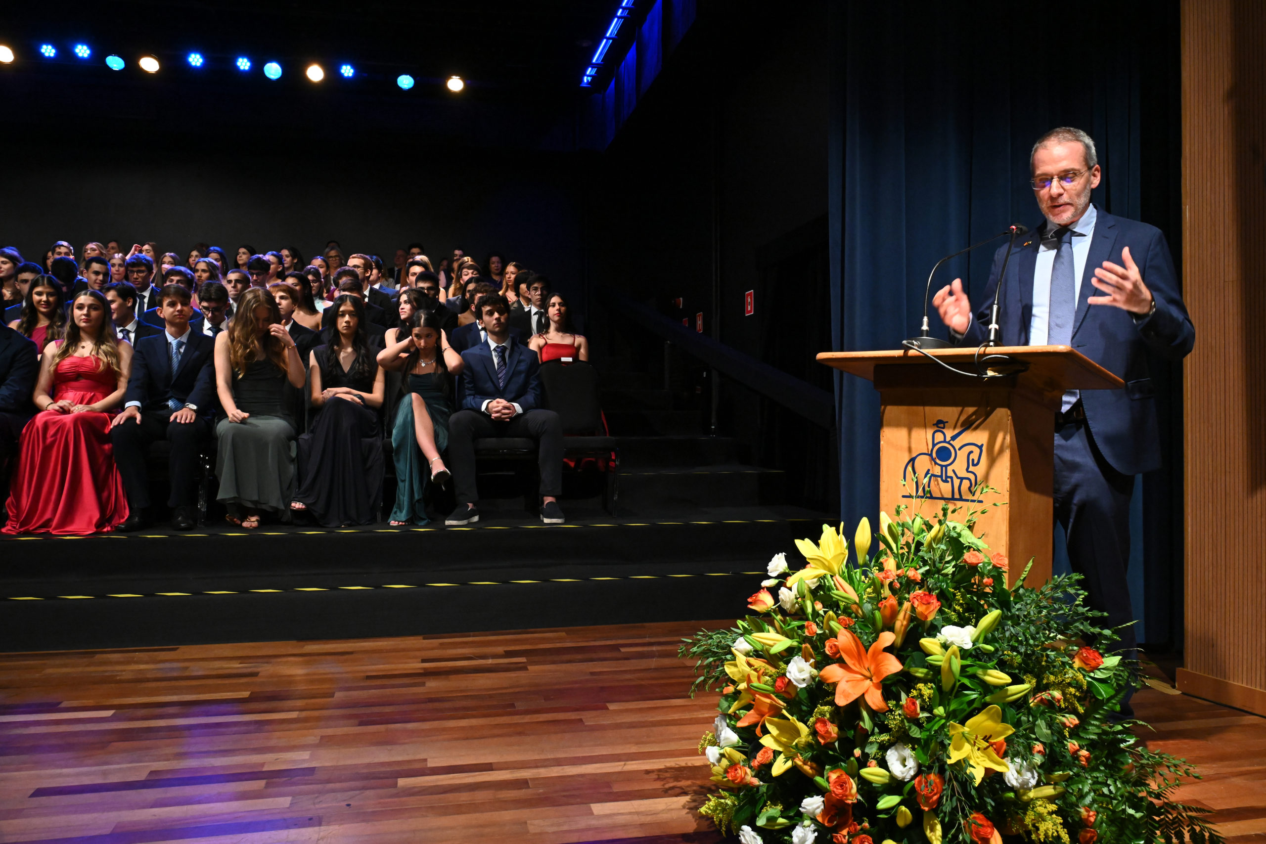 O discurso do diretor-geral, Jorge Berné, foi marcado por emoção e inspiração, celebrando o encerramento de um ciclo importante na vida dos alunos e reforçando o impacto transformador da educação. Ele destacou o carinho e dedicação empregados na preparação da cerimônia de formatura, reconhecendo que o término da educação básica não representa o fim da história dos estudantes, mas sim o início de novas jornadas repletas de decisões, conquistas e contribuições para a sociedade. O diretor enalteceu os valores e aprendizados adquiridos na escola, como a responsabilidade social e a empatia, exemplificados pelas ações de voluntariado dos alunos. Também mencionou com carinho momentos marcantes, como o projeto das estrelas nas escadas, a viagem à Brasília e o crescimento coletivo do grupo ao longo dos anos. Por fim, com um poema inspirador de Alfredo Cuervo Barrero, incentivou os formandos a buscarem sua felicidade, lutarem por seus sonhos e deixarem uma marca positiva no mundo, encerrando com votos de felicidade e sucesso a todos os presentes.