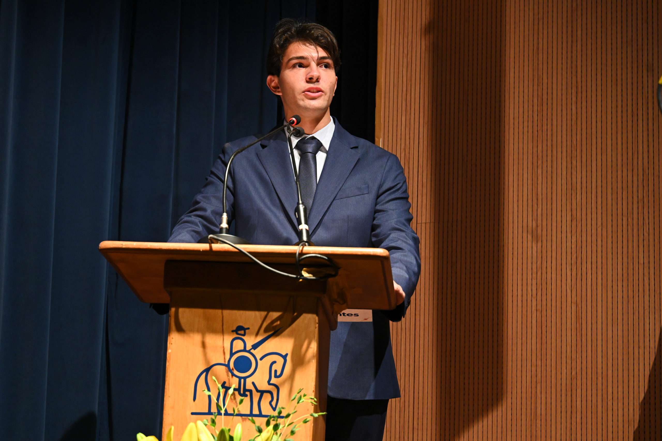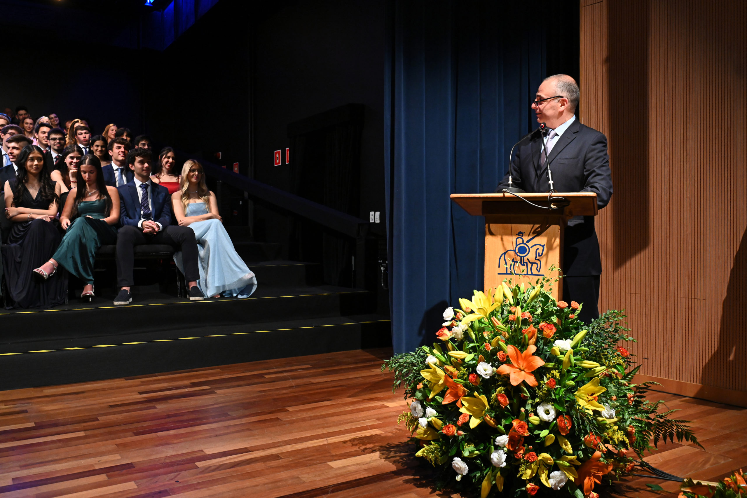 O discurso do diretor-geral, Jorge Berné, foi marcado por emoção e inspiração, celebrando o encerramento de um ciclo importante na vida dos alunos e reforçando o impacto transformador da educação. Ele destacou o carinho e dedicação empregados na preparação da cerimônia de formatura, reconhecendo que o término da educação básica não representa o fim da história dos estudantes, mas sim o início de novas jornadas repletas de decisões, conquistas e contribuições para a sociedade. O diretor enalteceu os valores e aprendizados adquiridos na escola, como a responsabilidade social e a empatia, exemplificados pelas ações de voluntariado dos alunos. Também mencionou com carinho momentos marcantes, como o projeto das estrelas nas escadas, a viagem à Brasília e o crescimento coletivo do grupo ao longo dos anos. Por fim, com um poema inspirador de Alfredo Cuervo Barrero, incentivou os formandos a buscarem sua felicidade, lutarem por seus sonhos e deixarem uma marca positiva no mundo, encerrando com votos de felicidade e sucesso a todos os presentes.