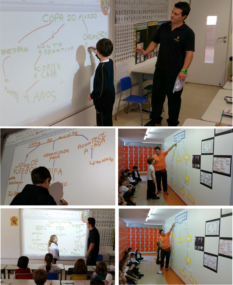 De manera dinámica y lúdica, los niños construyeron un mapa. De entrada, definieron las palabras clave y sus relaciones, registrándolas en la pizarra digital. Después de la construcción del mapa conceptual digital, escribieron las palabras en pequeños papeles y enfrentaron un nuevo desafío: construir un mapa conceptual gigante. En la etapa siguiente, construyeron el mapa en un panel, montándolo como un rompecabezas y reforzando los conceptos trabajados en clase.