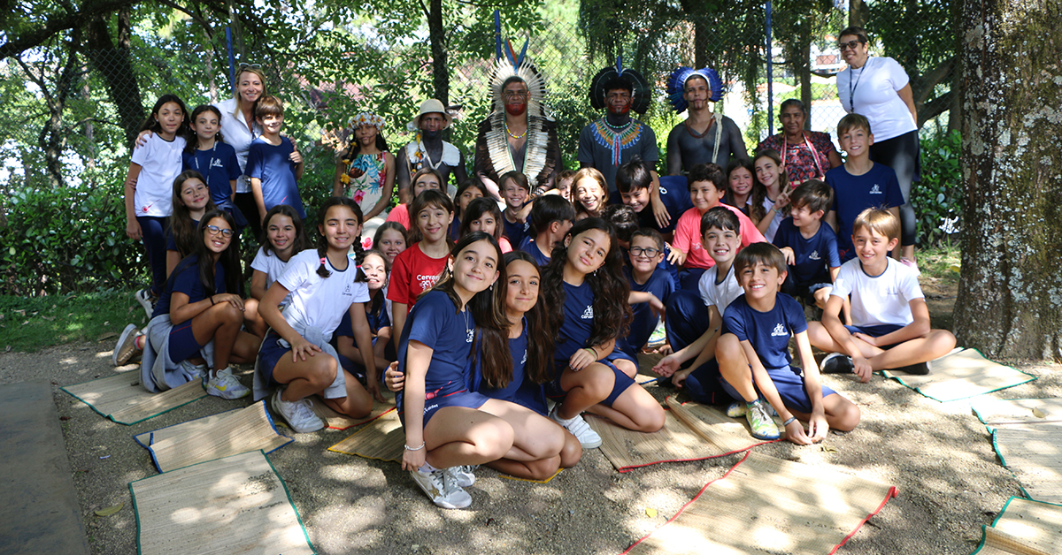 Foto em grupo dos alunos do 4º ano com os indígenas do povo Fulni-ô.
