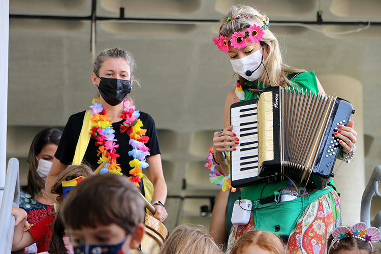 A musicalidade ficou bem harmoniosa acompanhada do acordeom e da batucada. Mas acordeom no Carnaval? Sim… Isso mesmo! O acordeom é o piano que saiu do palco, dos eventos em salões nobres e palacetes, aproximando a música do povo. É justo, portanto, que ele esteja presente no nosso desfile trazendo a melodia para o Carnaval Cervantino da Educação Infantil e 1º ano do Ensino Fundamental.