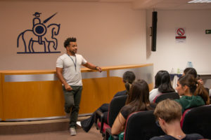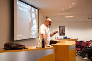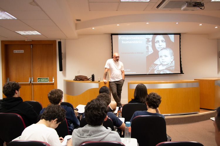 O jornalista apresentou trabalhos realizados em situações diversas: em um campo de refugiados no Líbano, com pessoas em situação de rua em São Paulo e até com os macacos de um zoológico. Ao longo da exposição, destacou a importância da técnica — como enquadramento e iluminação —, mas também a necessidade de sensibilidade e ética para retratar realidades delicadas.