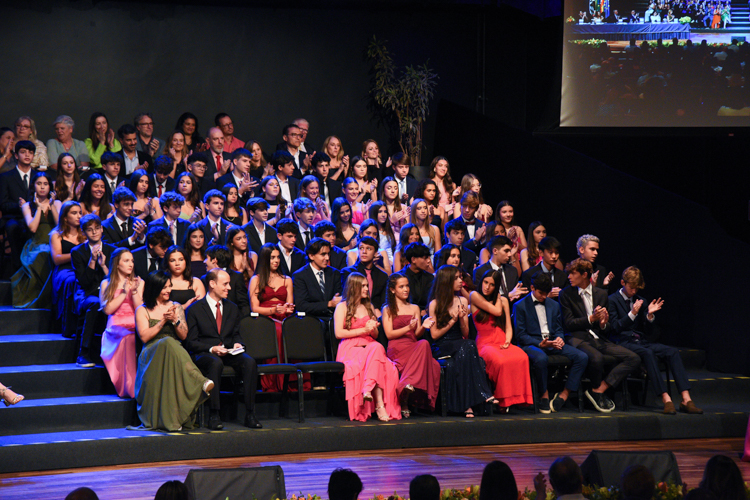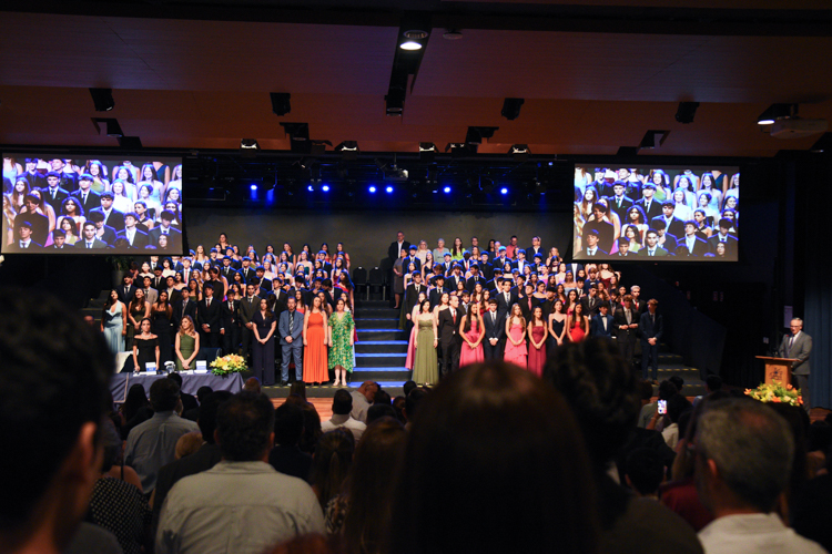 A mesa solene contou com a presença do diretor geral Jorge Berné, do diretor de ensino Rudney Soares, da diretora administrativa Silvia Rizzi, da diretora de nível Eva Fraile e da equipe de orientação do Ensino Fundamental Anos Finais, Vivian Cristianini e Karin Arriagada.