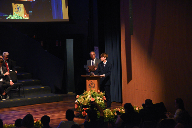 Em seguida, os oradores das turmas, Laura Porto Cabral e Matheus Martins Munhoz, compartilharam lembranças dos anos de convivência, destacando a amizade e o companheirismo da turma, com menção especial à viagem à Espanha.