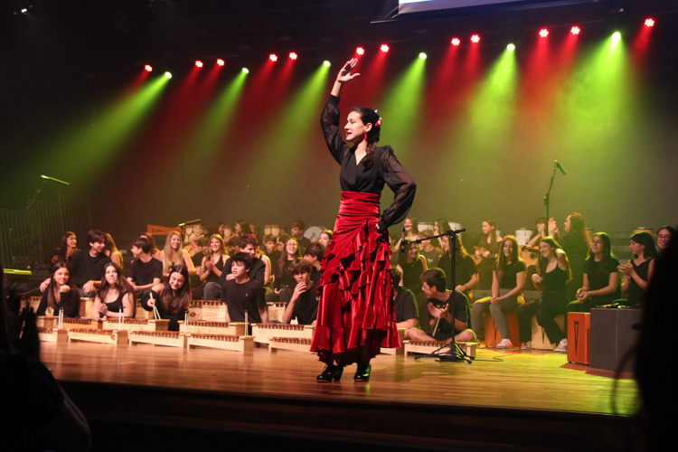A apresentação dos 9ºs anos trouxe os ritmos ijexá de “Andar com fé”, de Gilberto Gil, ritmo de matriz iorubá e Ilê Ayê”, de Paulinho Camafeu, celebrando o canto coletivo como expressão de identidade afro-brasileira. Os ritmos flamencos incorporados ao repertório como parte da preparação para a viagem à Espanha estiveram presentes em “Campanitas de la aldea”, de Francisco de Val e “Almoraima”, de Paco de Lucía com participação especial da aluna Stella Pires bailaora flamenca. Além disso, o público pôde desfrutar da execução de “Get Lucky”, de Pharrell Williams e Nile Rodgers e “Viva la Vida”, da banda Coldplay.