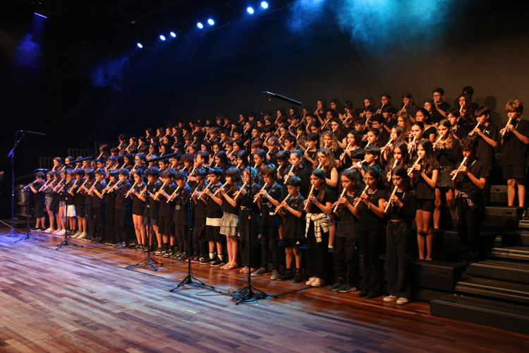Por fim, o 5º ano levou ao palco um repertório de intensidade e personalidade. “Malagueña Salerosa” trouxe desafios de articulação inspirados na música hispânica; “Eu só quero um Xodó” incorporou o swing do forró nordestino; “Flor e o Beija-Flor” resgatou a influência da guarânia paraguaia na música latino-americana; e o encerramento com “Sweet Child O’ Mine”, do Guns N’ Roses, elevou a energia da plateia, evidenciando domínio rítmico, respiração, presença de palco e integração do grupo.