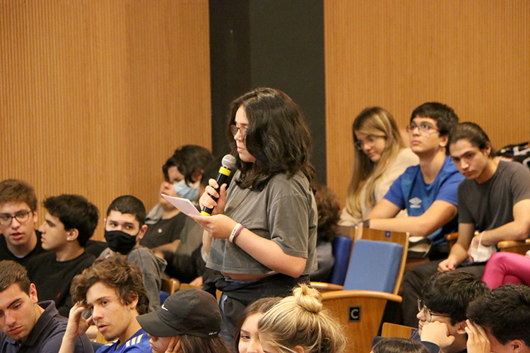 Durante las preguntas de los alumnos, Nathália respondió sobre el lugar de la mujer en la comunidad científica, sobre el movimiento antivacunas en Brasil, la desinformación y la imposibilidad de la inmunidad de rebaño en relación con el Covid-19 y el peligro de las super bacterias. Carlos Orsi habló sobre la idea de la verdad científica, sobre la condición humana de la ignorancia y sobre la probabilidad como herramienta de cuantificación de la incertidumbre, que combate la expectativa irreal de la certeza absoluta.