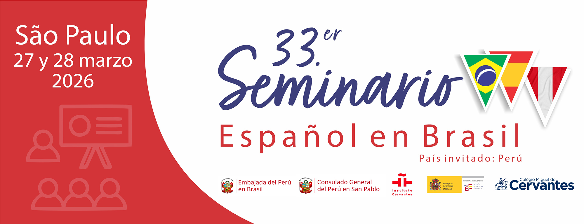La Consejería de Educación de la Embajada de España en Brasil y el Colegio Miguel de Cervantes te invitan a participar en la XXXIII edición del Seminario Español en Brasil, que tendrá lugar los días 27 y 28 de marzo de 2026 en el Colegio Miguel de Cervantes de São Paulo. En esta ocasión, tendremos como país invitado a Perú.